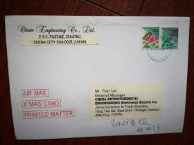 实寄封(内附信一封,书签一枚。读大学的表姐至读初中的表妹),北京外交学院至吉林市吉化实验学校,2001年12月1日发,4日,7日双投递戳。贴普29长城80分邮票,美术信封花鸟画