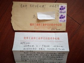 实寄封(内附信一封,刚大学毕业的同学之间),天津至吉林市吉化化肥厂,1984年5月4日,6日双戳清晰。贴普22海南风光4分邮票两枚连票,化工部第一设计院工业炉设计技术中心站公函封。