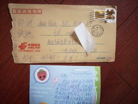 实寄封(内附信四封,自制名片四个。小学女生至另一小学的四名女生),吉林市船营区25小学至吉林市吉化实验七小,2001年12月4日,贴普29长城60分邮票,美术信封珍惜