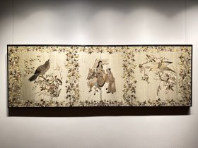 织锦画:飞天之路 长空花木兰,云天娘子军 长2.5米,宽0.6米 王作仁画,王丹书写,杭州都锦生丝织厂用传统工艺生产, 有所有女飞行员亲笔签名,被国家博物馆收藏
