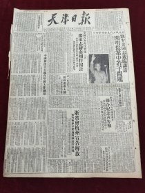 民国三十八年五月天津日报1949年5月6日华北职工代表会议第4日刘少奇同志亲临讲话阐明提案中若干问题全国首次青代会第2天廖承志蒋南翔作报告中国新民主主义青年团工作纲领浙省会杭州宣告解放赣东克万年俘敌4000续溪巨容安告解放黄敬纪念五四王连凯津一区青年工人纷纷要求入团肃清匪残余巩固天津革命秩序