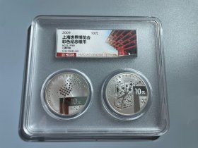 2009年上海世界博览会彩色纪念银币,1盎司999纯银,面值10元。正面是世博会标志,背面是地球图案。HCGS评级PF69分,带原装保护盒和证书,品相完好,保存完整。