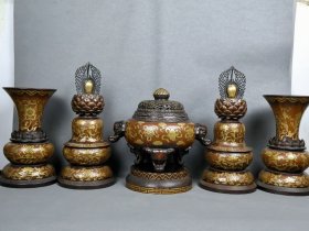 紫铜雕花鎏金五供,蜡台高40厘米,花鼓高30.3厘米,香炉高31厘米,总重41900克,一套¥48000
