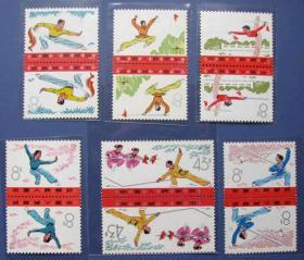 T7(1976年发行),武术(刀术、剑术、拳术、枪术、棍术和三节棍对双枪 )双连对倒(共二套邮票)每套6张--全新全套邮票甩卖--实拍--包真--罕见