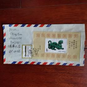 80年代清华大学教授何兆武寄英国郑泉水信封,贴第二次集油大会小型张,古钱币70分邮票。。