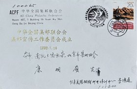 中华全国集邮联合会集邮宣传工作委员会成立纪念封,贴延安座谈会讲话邮票,盖1992年7月16日北京怀柔日戳和纪戳实寄,李鸿远寄。