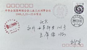 集邮联-17:中华全国集邮联合会二届三次理事会议纪念封,贴己巳年蛇票,盖1989年2月21日河北石家庄4(支)日戳和2枚纪戳实寄,刘广实寄。