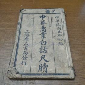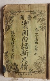 民国五年线装《实用白话新尺牍》后附各种商业文件,各界适用之教本,序、总目录:家书类、问候类、交际类、约叙类、遗赠类、庆贺类、慰问类、请托类、规谏类、商务类,附录数十种详目不及借载。第一册目录,详见拍照目录部分。第二牌记是狄公篆书,广益书局编印。很值得借鉴收藏的《普通实用白话尺牍。收藏完好,内容完整.