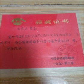 获奖证书(作品《总书记在宁夏扁担沟看望回族农民》)在第十一届全国新闻摄影作品评选中获铜牌奖。