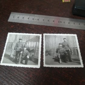 老照片:二军人持枪照二张(帽徽:国徽,手套)