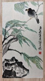 现当代名家龚继先《柳荫八哥》软片真迹(68厘米,34厘米)。(1939年3月—),男,北京人,中国画家。1963年毕业于中央美术学院国画系,师从李苦禅、李可染、叶浅予等名家,擅长水墨大写意花鸟画及指墨花鸟画。历任上海人民美术出版社美术编辑、副总编辑、社长兼总编辑,主编《艺苑掇英》丛刊并主持出版《中国美术全集》。1999年退休后任一级美术师,1958年考入中央美术学院中国画系,系统学习北派笔墨技法。