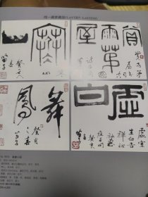 散页美术资料(印刷品)—————书画-——篆书小品四幅【黄苗子】,行书福寿诚【董寿平】,行书立轴【李苦禅】,行书立轴【毓嶦】,金鸡报晓【王震】2121