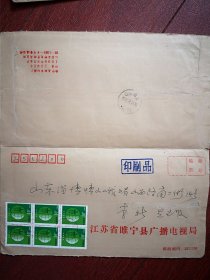 重复使用实寄封,正面睢宁县广电局公函信封(印数2千)睢宁至博山,2002年4月3月,普30保护家园10分邮票六枚方连。背面博山至吉林市通江街铁合金中学,2003年6月17日,邮戳完整清晰,贴普30保护家园60分邮票