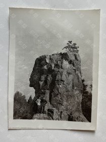 老照片,黄山风景,自然景观与人文瞬间,画面中央的奇石形态嶙峋,表面肌理分明,顶部生长的树木展现了生命与岩石的共生之美。前景中两位人物的着装与姿态显得自然随意,构图平衡,通过岩石的刚性与树木的柔韧、自然景观与人类活动的对比,传递出人与自然互动的永恒主题。 黄山的奇松怪石是标志性景观,尤其是顶部生长松树的花岗岩峰林造型极为典型(尺寸参看图中尺子)