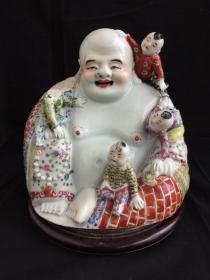 禅林取意行:晚清瓷像精残一尊:胎体厚重,白青色釉水滋润与满工厚彩形成繁简鲜明的强烈对比。开脸慈善宁静,众童子爬上其身,形态各异,任由嬉戏,快乐坦荡,戏谑幽默。此尊历经岁月,虽残仍珍。寺破剩看景依在,塔高留得夕阳明。千帆过尽尤灿烂,瞬间诧寂堪永恒。