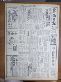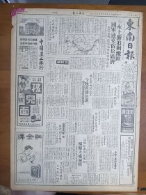1947年12月31日 东南日报:汉水上游追剿流匪连克宿松广济,政院会议通过徐永昌执长陆军大学,沈阳外围布就铁网酝酿大歼灭战,大别山刘伯承部消息,海南岛铁矿年初运日,华北解放军进攻察东冀北,民国三十六年国内外大事迹,槡榆《香港与上海的比较观游港七日记》,文史专栏有王宜昌、宋炎、沈延国等人文章,士人《狂人日记研究》,长春专栏有李佳、仇重、傅涯等人文章,刃峰木刻作品, 大量民国体育消息 ,品差特价,