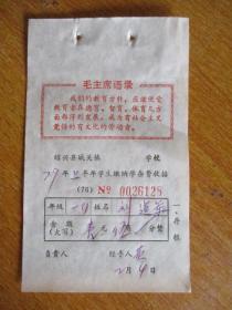 绍兴县鲁迅小学学习缴纳学杂费收据(存根联)(上半张是毛主席语录)(76年单子79年用)【学生刘建军】