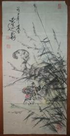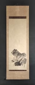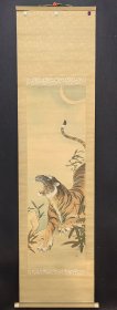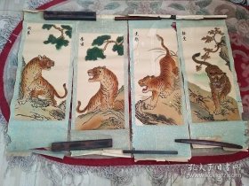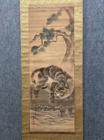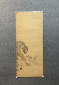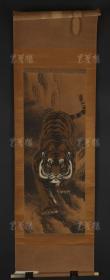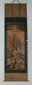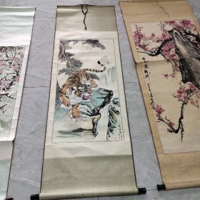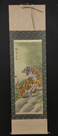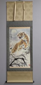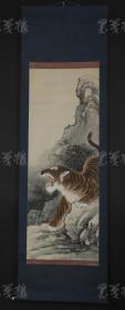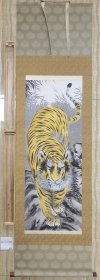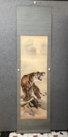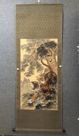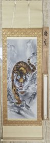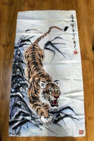 寇忠画作,戊寅年(1998年)手绘国画《猛虎上山图》木柄卷轴绢本装裱,尺寸:160*77厘米,画心尺寸:125*65厘米,品如图, 300包邮。