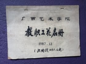 上世纪八十年代《广西艺术学院教职工花名册》,内有阳太阳、刘宇一、黄格胜、郑军里、黄闪夜、朱培均、陈玉圃、梁耀、雷务武、余永健、柒万里、陈再乾、阳山等诸多著名画家。