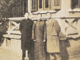 民国时期三帅哥西装革履风衣合影照片(敏德相册,敏德应该民国时期毕业于宁波某中学,考取山东省立工业专科学校(1950年改为山东工学院,现为山东工业大学),其女朋友应该毕业于青岛工学院。后就职于电力部北京水利发电设计院,后支援云南来到国家电力部昆明水电勘测设计院)